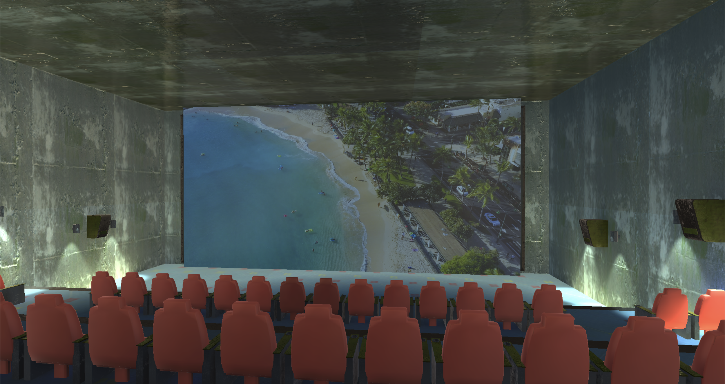 The cinema is desolate, empty rows of seats show no signs of the premier of Pixar’s Onward from March 2020. Clicking on the cassette player next to the movie theatre allows one to toggle through the collection of videos displaying stock footage of people commuting, working, gathering, and then eventually shift to videos of the events of the current pandemic. The ambient lighting from the spotlights surrounding the movie theatre also correlate with the content appearing on the screen, using the average color of each frame as the color for each light source. Each seat is able to be clicked on to move the player to the seated position.